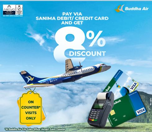 सानिमा बैंकको भिसा डेबिट÷क्रेडिट कार्ड प्रयोगकर्ताले डिजिटल भुक्तानी गरेर बुद्ध एयरको सिटी सेल्स अफिस वा एयरपोर्टको काउन्टरबाट छूट पाउने बैंकले जनाएको छ ।