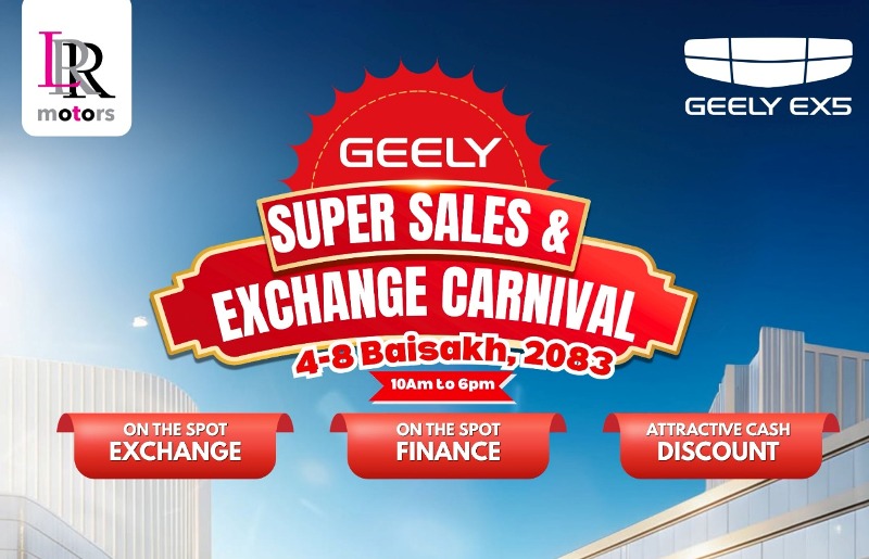 काठमाडौं । जिली ईएक्स५ म्याक्स तथा प्रो विद्युतीय सवारी साधनका आधिकारिक आयातकर्ता तथा वितरक एलआरआर मोटर्सले ग्राहकलाई उत्कृष्ट मूल्य, सुविधा र आकर्षक अनुभव प्रदान गर्ने उद्देश्यसहित बैशाख ४ देखि ८ सम्म काठमाडौँको गैरीधारास्थित जिली शोरुममा बहुप्रतिक्षित ५ दिने “सुपर सेल्स एण्ड एक्सचेन्ज कार्निभल” आयोजना गर्ने भएको छ।